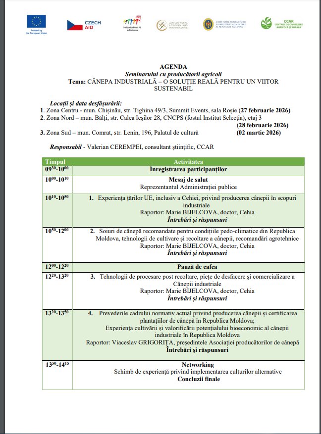 Семинар организован CCAR в сотрудничестве с Министерством сельского хозяйства и пищевой промышленности, Чешским агентством развития (CzDA) и Ассоциацией производителей промышленной конопли Республики Молдова.