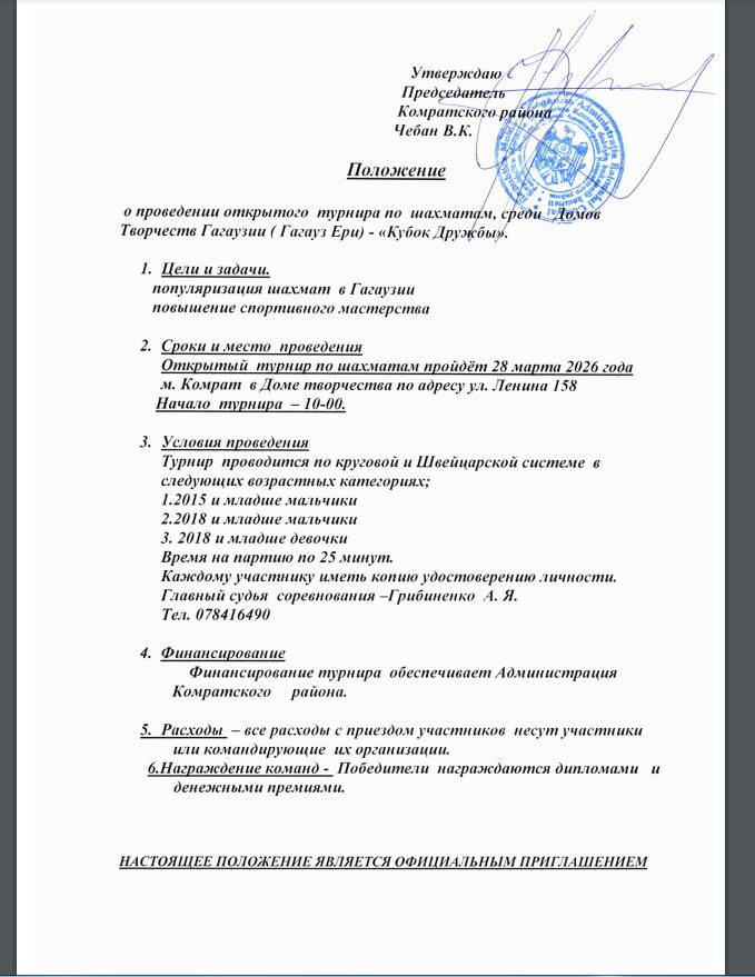 26 февраль 2026 0 1 2 3 4 5 Открытый турнир по шахматам в Комрате среди Домов Творчеств Гагаузии (Гагауз Ери) -"Кубок Дружбы" Даты проведения: 28 марта 2026г. Место проведения: Дом творчества, мун. Комрат, ул. Ленина, 158 Участие открыто для всех учеников региона! Для победителей предусмотрены ценные призы: дипломы и денежные вознаграждения. Дополнительную информацию можно получить по телефону: +373 787 91723 (Г.Д. Манастырлы). Приходите поддержать своих друзей и показать свое мастерство игры в шахматы! Подробнее читай тут