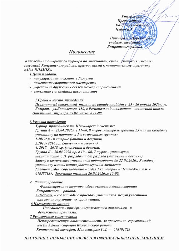 Приглашаем всех желающих учеников образовательных учреждений Комратского района принять участие в открытом шахматном турнире, посвящённого дню гагаузской письменности "Ana dilimiz".