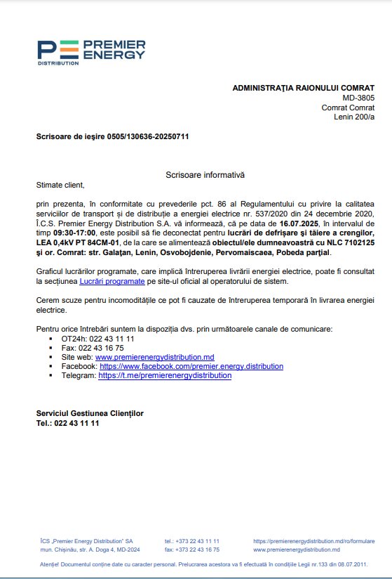 Î.C.S. Premier Energy Distribution S.A. информирует о том, что 16.07.2025г. в интервале времени 09:30 – 17:00 час. возможно отключение воздушной линии электропередачи, для проведение работ по вырубке леса и рубке сучьев в мун. Комрат: улицы Галацана, Ленина, Освобождение, Первомайская, Победа частично.