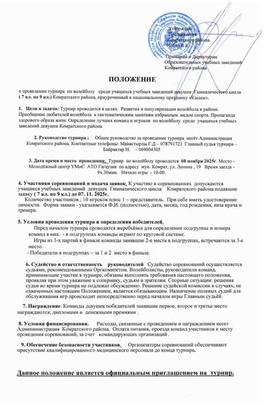 Двери открыты для всех девчонок учебных заведений Комратского района! Мы рады пригласить вас на волнующий спортивный праздник — турнир по волейболу, посвященный традиционному дню "Касым"!